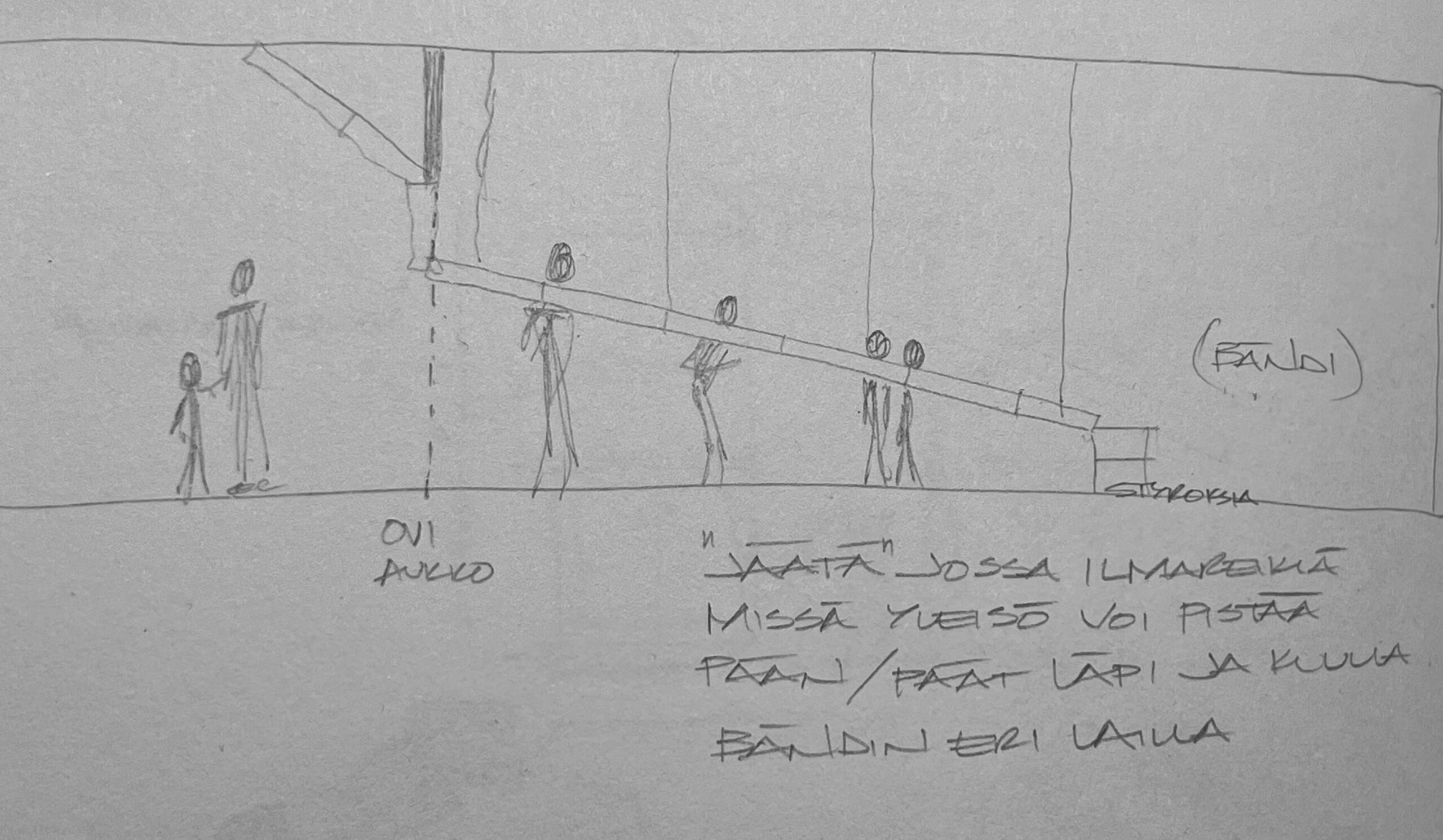 ”Pinnan alla on akustinen sokkelo, jossa ihmiset liikkuvat teoksen aikana”, kertoo teoksen idean alkuunpanija, säveltäjä Tiina Myllärinen. Viisihenkiselle soitinensemblelle ja nelihenkiselle lauluyhtyeelle sävellettävä teos kuljettaa kuulijoita akustisesti erilaisiksi rakennettujen tilojen läpi. Tilojen toisistaan poikkeavat akustiikat ovat osa teoksen dramaturgiaa. ”Esimerkki tällaisesta dramaturgian ja akustiikan välisestä yhteydestä on kohta, jossa hyvin kaikuisassa tilassa musiikki sameutuu ja eri äänet sekoittuvat toisiinsa. Dramaturgiassa tämä viittaa sellaiseen psykoosimaiseen mielen tilaan, missä raja itsen ja ympäröivän todellisuuden välillä katoaa”, Myllärinen kertoo akustiikan ja dramaturgian vuorovaikutuksesta teoksessa.