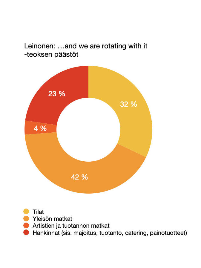 Leinosen sävellys …and we are rotating with it tuotti siis päästöjä yhteensä 0,9 tonnia CO2e:tä. Luku vastaa keskivertosuomalaisen noin kuukaudessa tuottamia henkilökohtaisia päästöjä. Mistä luku sitten muodostui? Alla olevasta taulukosta näkee miten suurin yksittäinen päästöjen tuottaja olivat matkat.